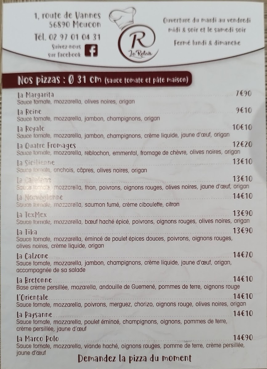 Welcome to Le Relais de Meucon, a delightful eatery nestled in the heart of France. This charming restaurant specializes in a tantalizing range of pizzas and burgers, perfect for casual dining. Their menu features the beloved Margarita pizza with fresh tomato sauce, mozzarella, and olives for just €9.00, and indulgent options like the Quatre Fromages at €14.00, sure to please cheese lovers.